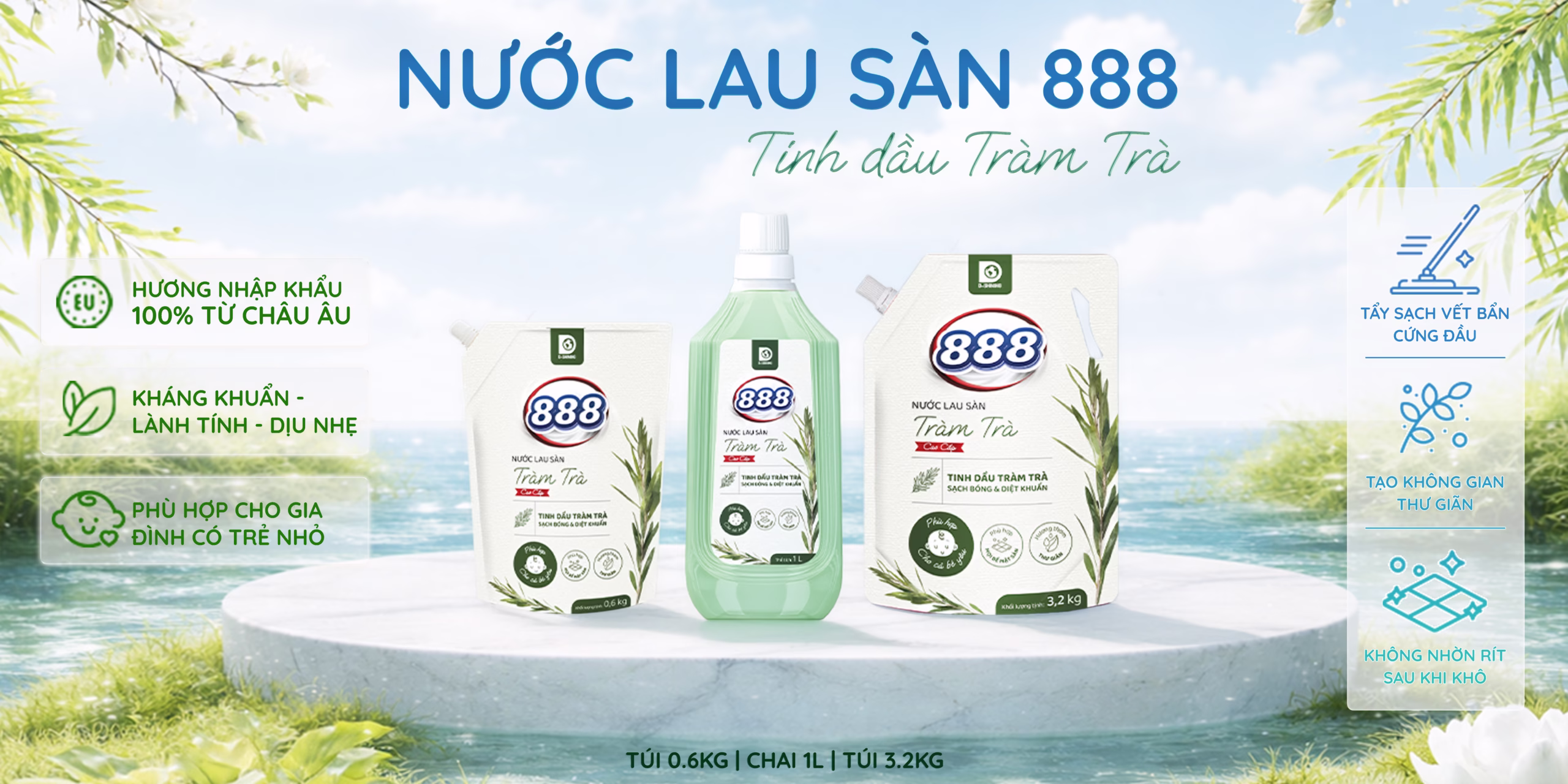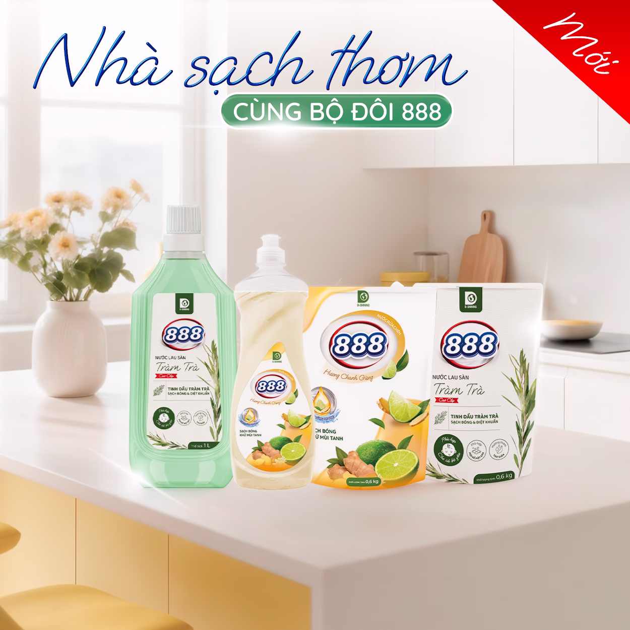 Nhà sạch thơm tinh tươm cùng bộ đôi ‘tân binh’ 888: Nước lau sàn tinh dầu Tràm Trà diệt khuẩn và Nước rửa chén Chanh Gừng dịu nhẹ. Giải pháp chăm sóc sức khỏe hằng ngày hoàn toàn tự nhiên, an toàn cho cả gia đình và trẻ nhỏ.