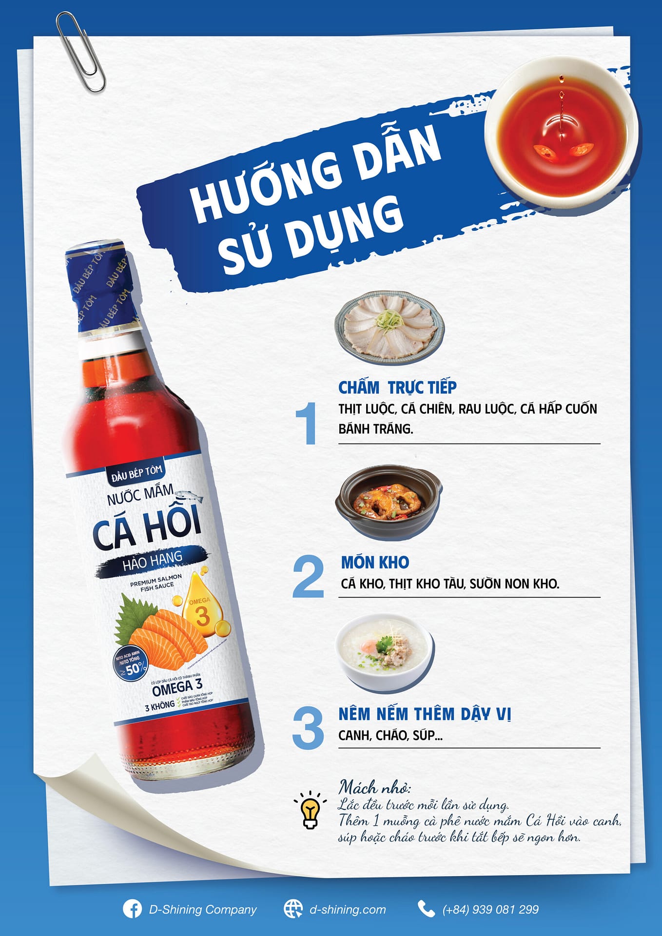 Mẹo: Nước Mắm Cá Hồi có lớp dầu cá hồi tự nhiên nên bạn hãy lắc đều trước khi dùng để Omega-3 hòa quyện, giúp món ăn đậm đà và dậy hương thơm hơn.